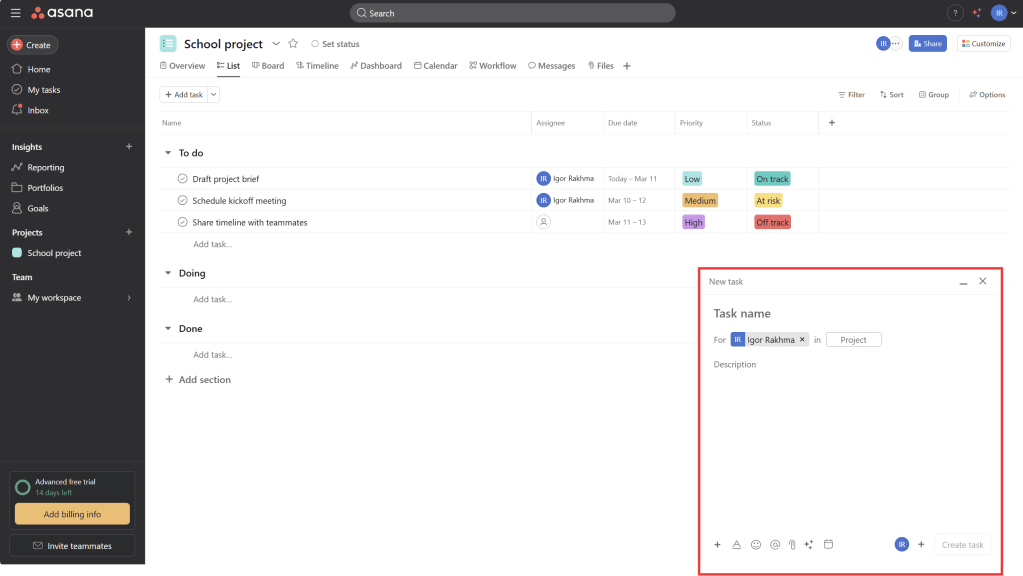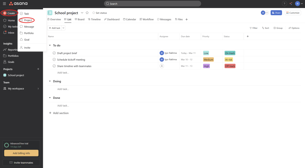 Asana is a powerful tool for task tracking, team collaboration, and workload management, especially in school projects. Here’s what you can do with Asana: