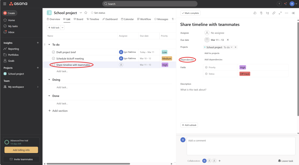 Asana allows you to set dependencies to ensure that one task is completed before another starts. This feature is helpful when tasks are linked (e.g., “Prepare materials for the conference” needs to be done before “Send materials to parents”). To set a dependency:- Click on a task.