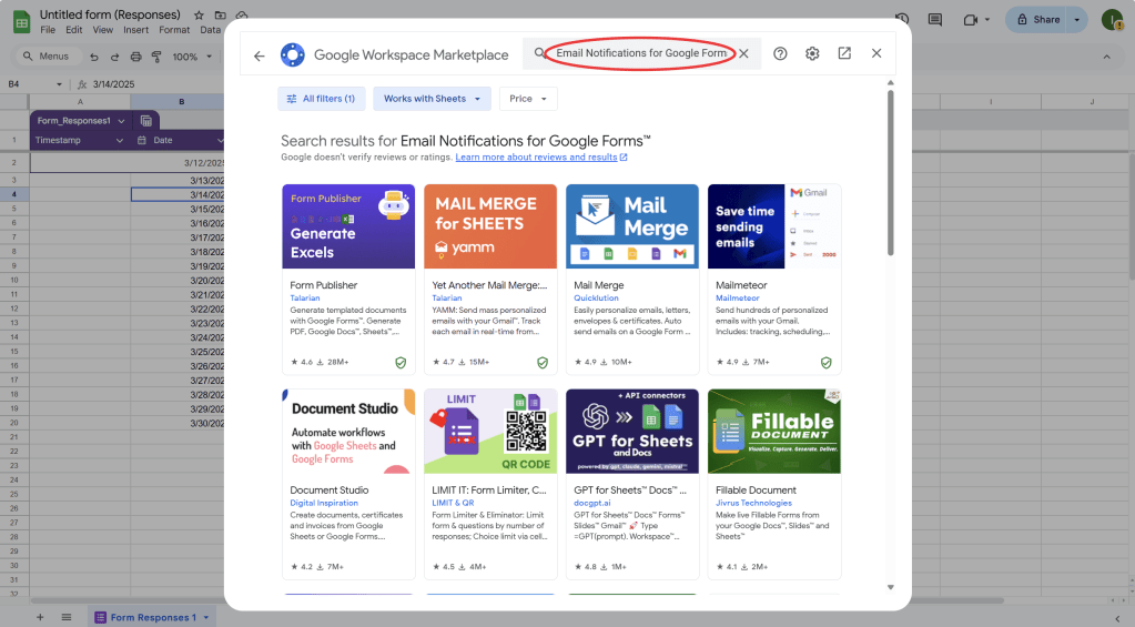 - To set this up, go to Add-ons > Get add-ons in Google Sheets and search for Form Notifications or Email Notifications for Google Forms.