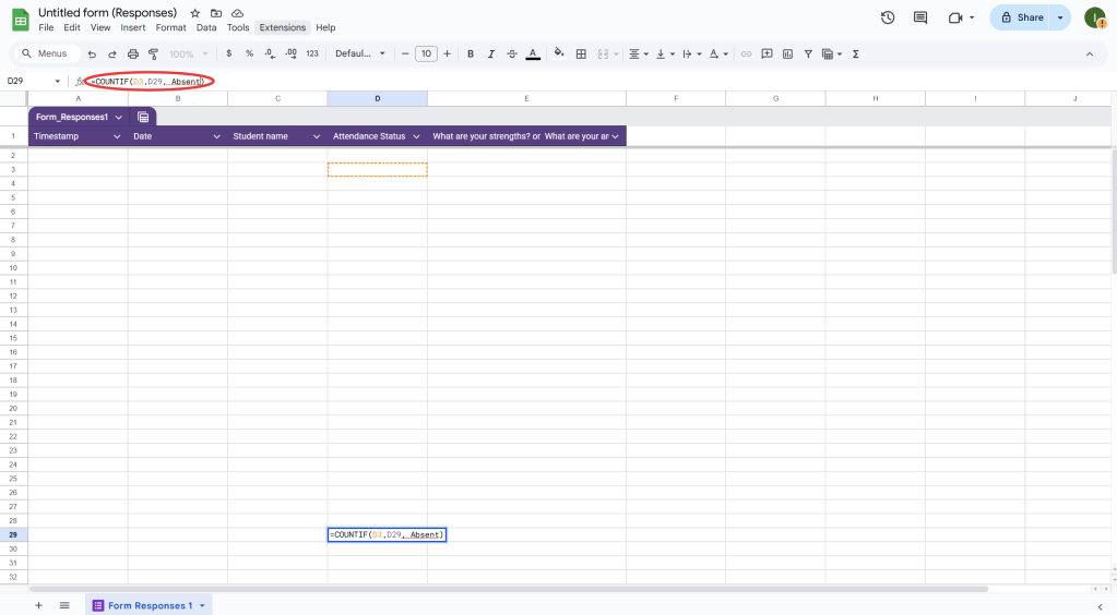 =COUNTIF(B:B, "Absent")to count how many times “Absent” appears). - Teacher evaluations: Use simple formulas like AVERAGE or COUNTIF to evaluate responses (e.g., counting the number of positive feedbacks or averaging scores).