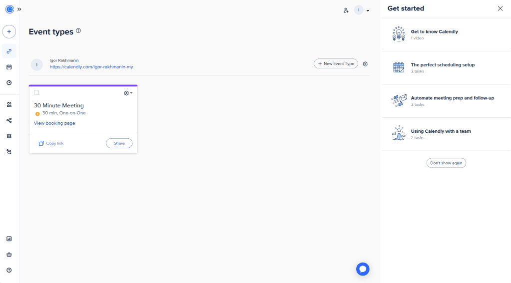 Calendly allows you to set up multiple types of meetings based on duration, purpose, and other preferences. For example: - 30-minute meeting