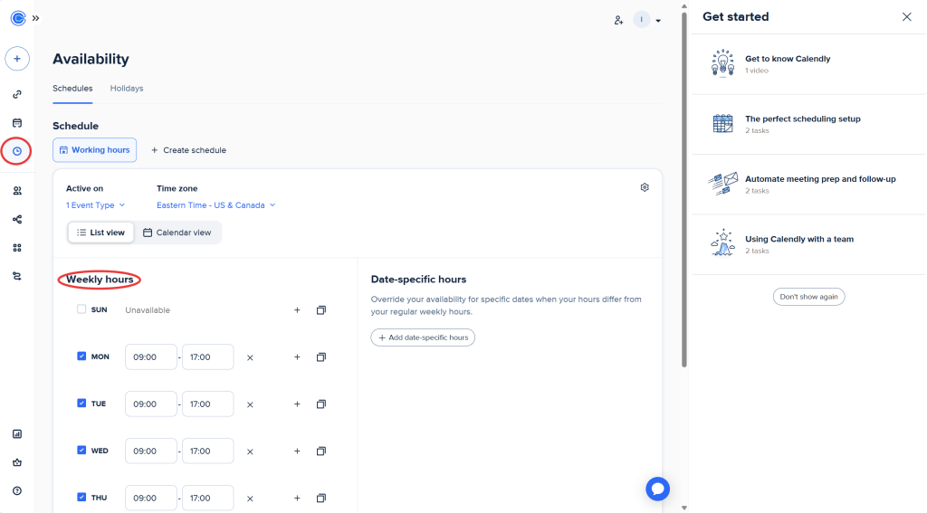 You can define your working hours or the times when you are available for meetings. This helps others book meetings within the times you specify.- Click on Availability in your Calendly dashboard.