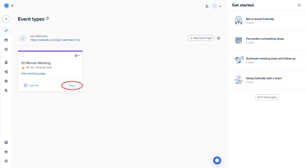 After creating event types, Calendly will generate a unique link for you to share with others. You can include this link in your email signature, website, or as part of meeting invitations.- Example link: