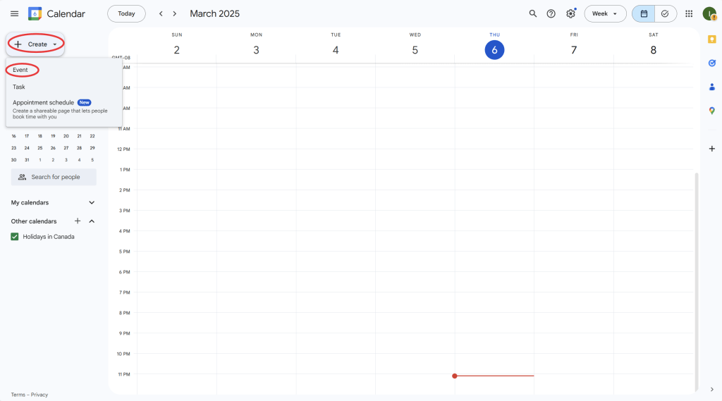- On the Google Calendar homepage, click the “Create” button located on the left side or directly on the calendar grid where you want to add the event.