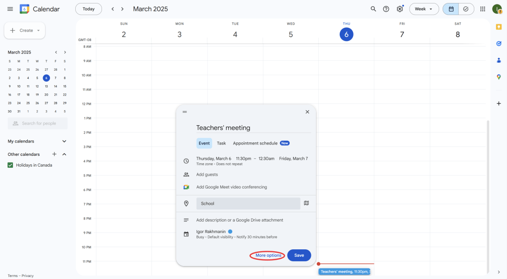 - If the event repeats (e.g., weekly meetings or monthly deadlines), click “Does not repeat” under the event details, and select the recurrence options (daily, weekly, monthly, etc.).
