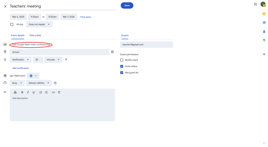 - If you’re using other Google tools like Google Meet, you can add a virtual meeting link by clicking “Add Google Meet video conferencing”.