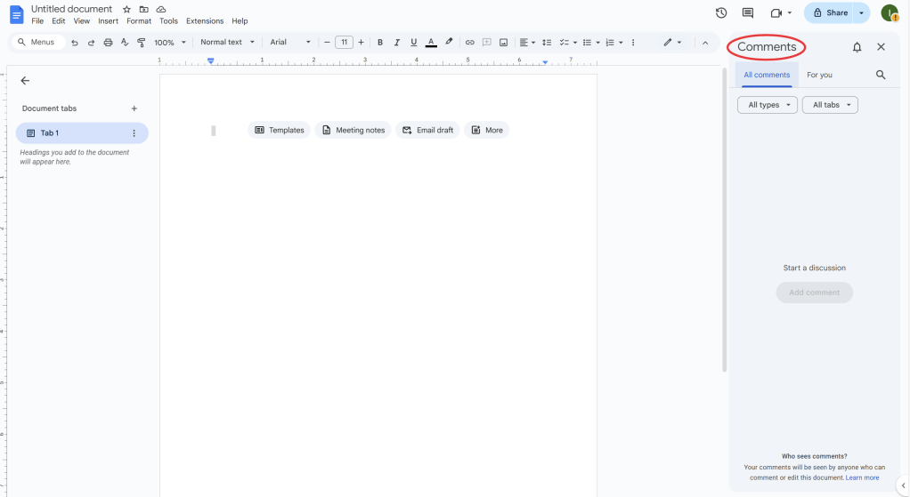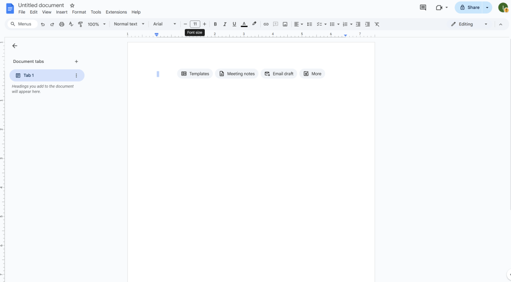 - On the Google Docs homepage, click the “+” (Blank) document or select a template from the “Template Gallery” if you prefer a structured format.