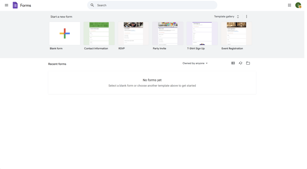 - On the Google Forms homepage, click the “+” (Blank) form button or select a template from the “Template Gallery” for specific types of forms (e.g., feedback, survey).