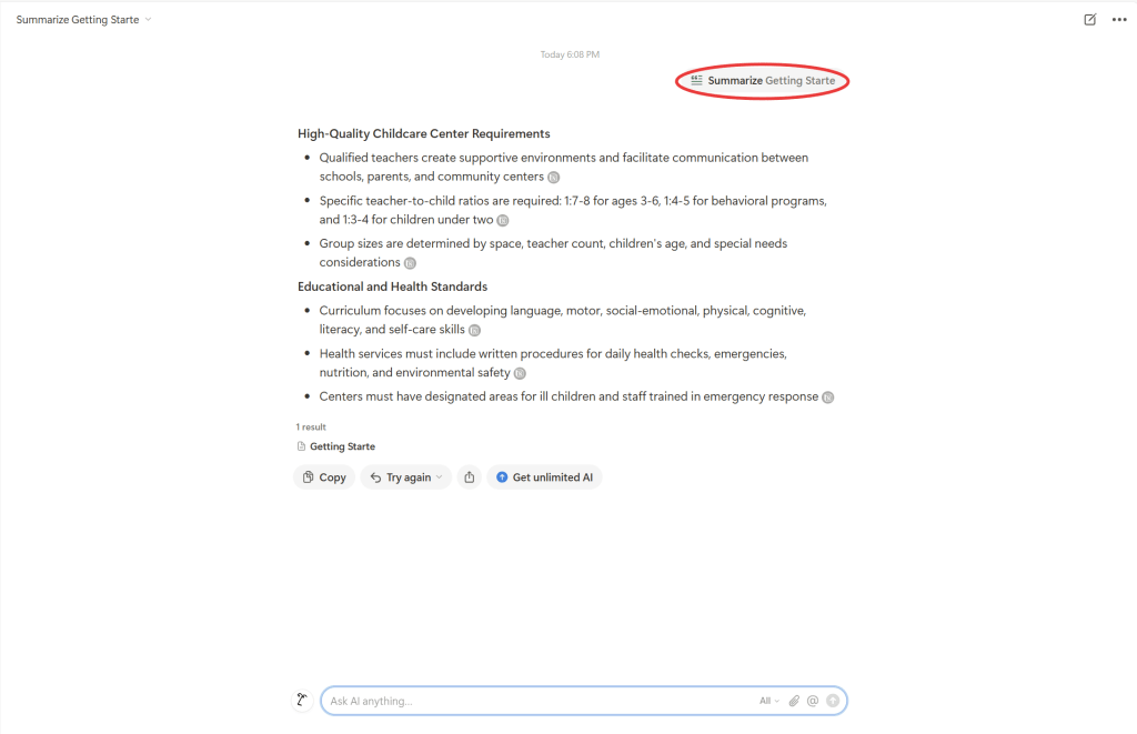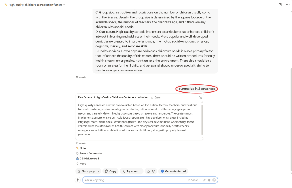 Once your content is in Notion, highlight the text you want summarized. - Use the Summarize Command: