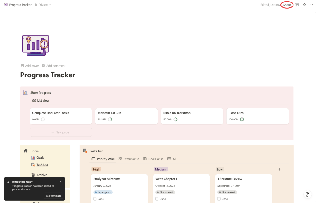 You can ask Notion AI to help you review your progress each week. For example, use the command:- “Summarize my tasks for this week.”